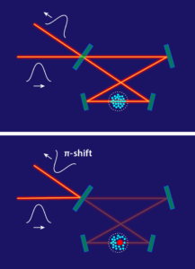 Para superar estas limitaciones, los equipos combinan los dos enfoques, colocando un superátomo de Rydberg dentro de una cavidad óptica. En ambos estudios, los investigadores utilizan haces de luz para manipular coherentemente el estado del superátomo dentro de la cavidad. Luego muestran que, dependiendo del estado del superátomo, la cavidad óptica manifiesta diferentes respuestas ópticas (Fig. 1 ). Si el superátomo permanece en su estado fundamental, los fotones pueden pasar a través de la cavidad, lo que muestra una alta transmisión. Pero si el superátomo está en su estado de Rydberg excitado, los fotones no pueden entrar en la cavidad y se reflejarán en su puerto de entrada. Tras la reflexión, la fase óptica de cada fotón se desplazará en π. Por lo tanto, este π-el cambio de fase se puede controlar cambiando el estado del superátomo.