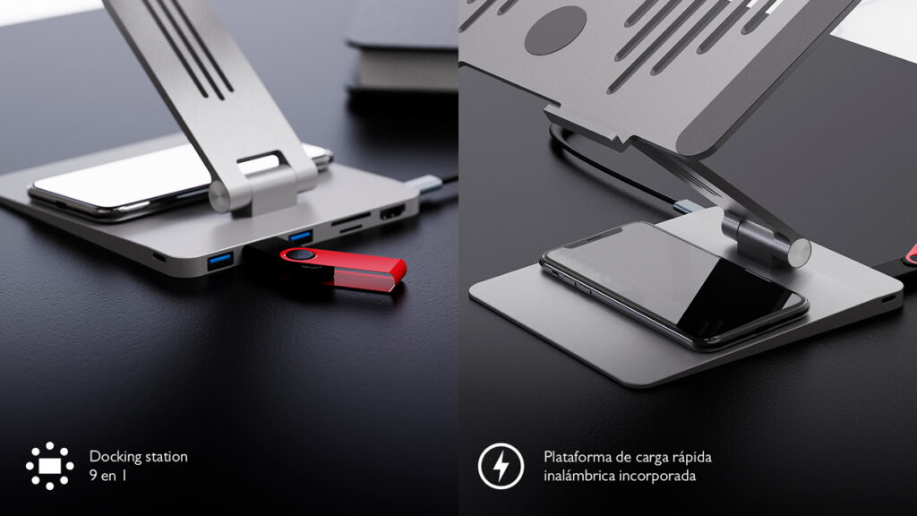 Tipo de producto: Estación de acoplamiento 9 en 1 con soporte para computadora portátil y plataforma de carga inalámbrica